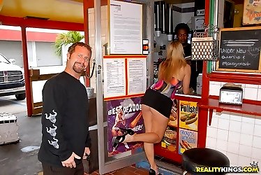 Amazing long leg mini skirt milf looking for a foot long hot dog gets her box stuffed with a huge dong in these hot reality porn pics and 3 minute video